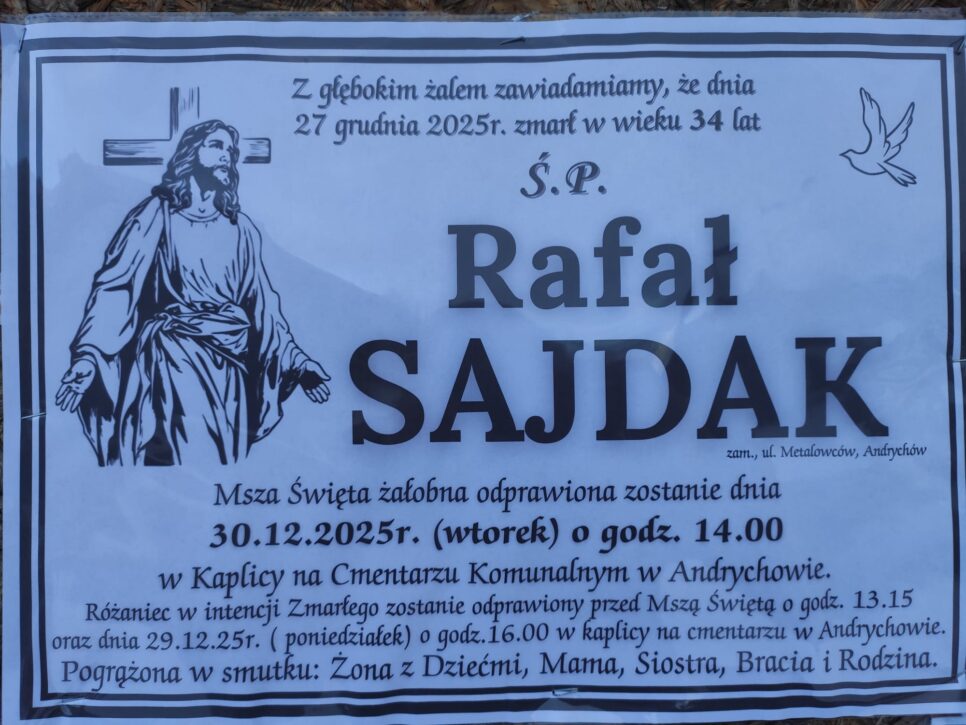 Msza święta żałobna zostanie odprawiona dzisiaj (30 grudnia) o godzinie 14.00 w kaplicy na Cmentarzu Komunalnym w Andrychowie. To tam rodzina i znajomi będą mogli po raz ostatni towarzyszyć mu w drodze na miejsce spoczynku.