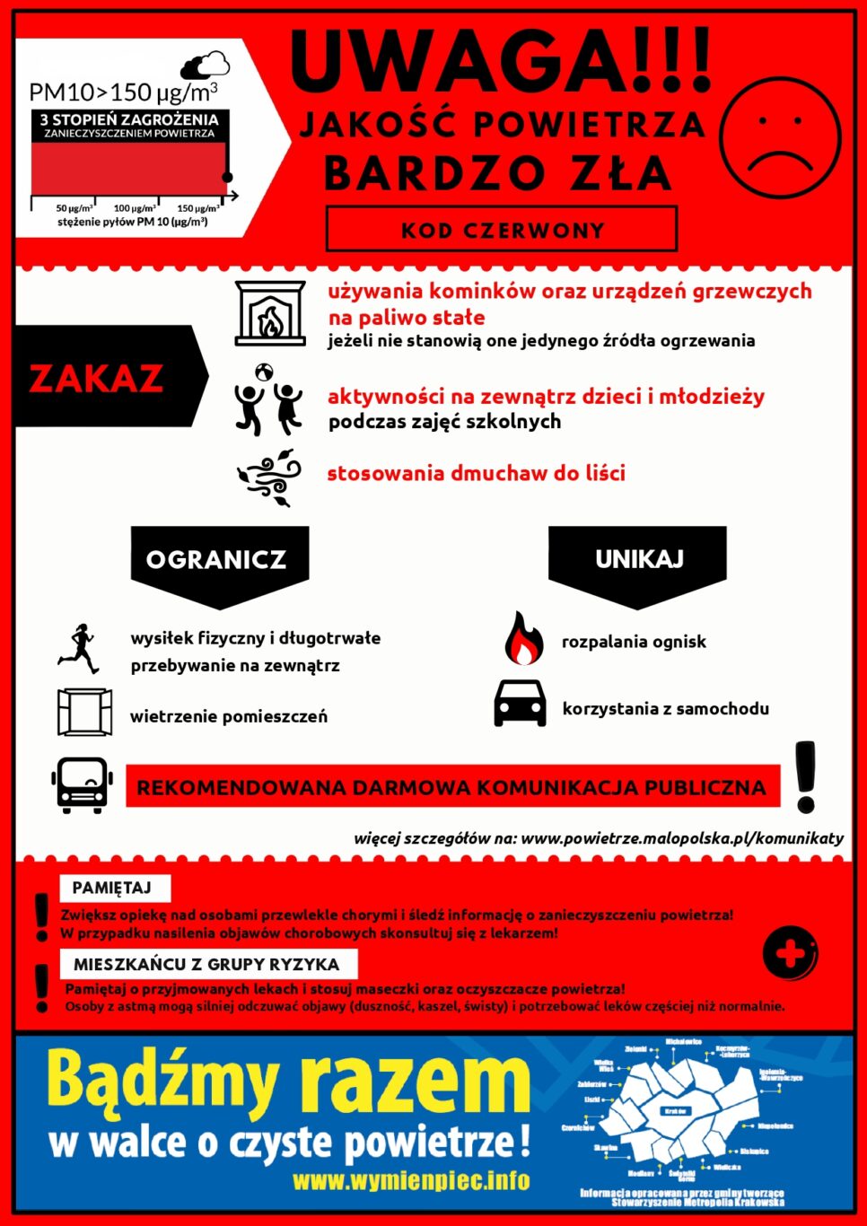 Ze względu na pogorszoną jakość powietrza mieszkańcy proszeni są o zachowanie ostrożności i ograniczenie działań zwiększających narażenie na zanieczyszczenia.