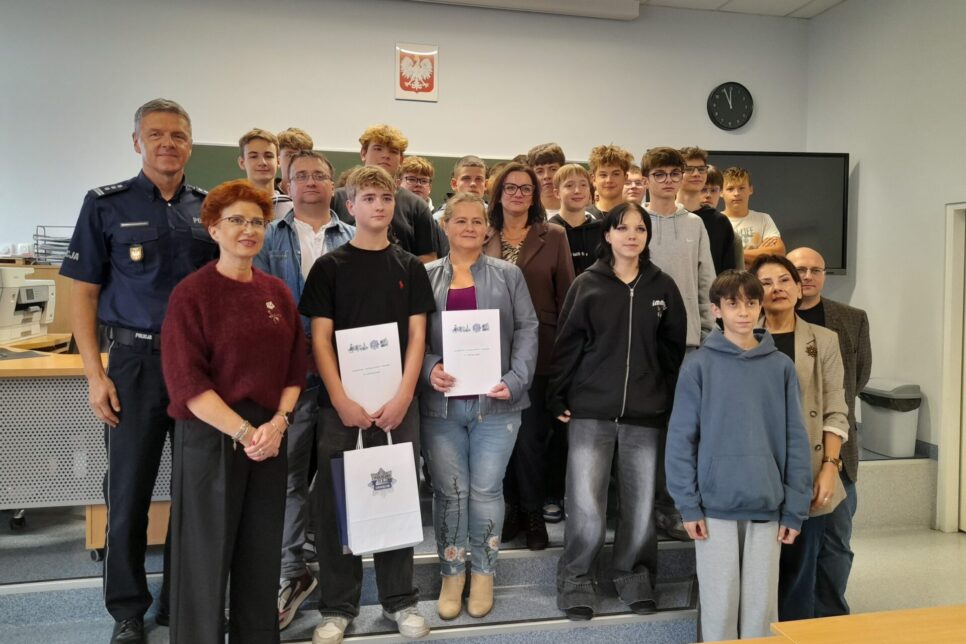 Komendant Powiatowy Policji w Oświęcimiu insp. Piotr Dziekanowski oraz Dyrektor Powiatowego Centrum Kształcenia Technicznego i Branżowego w Oświęcimiu pani Grażyna Gawłowska, wręczyli podziękowania za wzorową postawę obywatelską 15 – letniemu mieszkańcowi Osieka Konradowi Płonka, uczniowi pierwszej klasy o profilu technik mechanik pojazdów samochodowych Powiatowego Centrum Kształcenia Technicznego i Branżowego w Oświęcimiu.