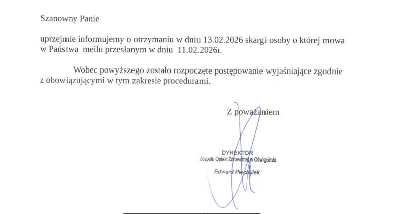 Równolegle kobieta wystąpiła do szpitala z formalnym wnioskiem o wydanie pełnej dokumentacji medycznej z okresu hospitalizacji. Sprawa została również zgłoszona do Rzecznika Praw Pacjenta oraz Okręgowej Izby Lekarskiej.