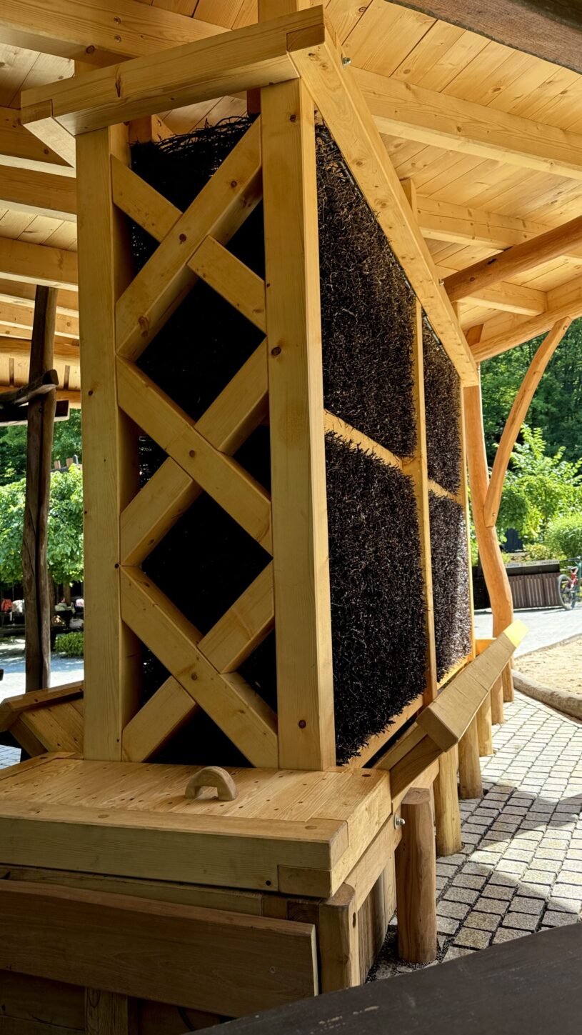 Gdy woda delikatnie przesącza się po gałązkach, w powietrzu tworzy się subtelna mgiełka przypominająca nadmorski aerozol. Każdy głęboki wdech przynosi porcję jodu, bromu, magnezu czy sodu, a organizm reaguje natychmiast – uspokojeniem oddechu, rozluźnieniem mięśni, poprawą samopoczucia. To inhalacja w najczystszej postaci, której nie trzeba szukać setki kilometrów dalej nad morzem. Tężnia wytwarza naturalny mikroklimat bogaty w jod, brom, magnez, potas i inne cenne mikroelementy. Wystarczy godzinna inhalacja, by dostarczyć organizmowi dawkę jodu porównywalną z trzydniowym pobytem nad Bałtykiem. Woda używana w tężni pochodzi z kopalni wody leczniczej Solankowa Kraina w miejscowości Sól, znanej z tradycji wykorzystywania solanki od XV wieku.