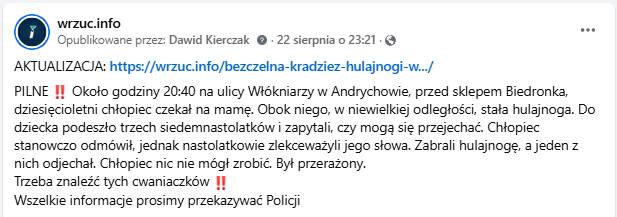 Wartość hulajnogi oszacowano na 2 tys. złotych. Funkcjonariusze podjęli natychmiastowe działania i w trakcie prowadzonych czynności ustalili, że pojazd ukryto w piwnicy jednego z bloków na terenie miasta. Sprzęt został zabezpieczony, a w sprawie zatrzymano 36-letniego mężczyznę, który nabył skradziony przedmiot. Usłyszał on zarzut paserstwa, za który grozi kara od 3 miesięcy do 5 lat więzienia. Policja podkreśla, że nadal prowadzi poszukiwania osoby odpowiedzialnej za samą kradzież.
