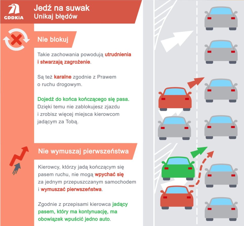 – a kierowca jadący pasem kontynuującym ruch powinien wpuścić jeden pojazd z kończącego się pasa.