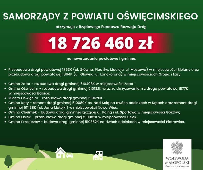 Największe wsparcie trafi do powiatu oświęcimskiego – 18 726 460 zł. W planach są m.in. przebudowy dróg powiatowych w Bielanach, Grojcu i Łazach, a także szereg zadań gminnych. Inwestycje zrealizują Zator, Oświęcim (gmina i miasto), Kęty, Chełmek, Osiek oraz Przeciszów. Prace obejmą zarówno rozbudowy nowych odcinków, jak i modernizacje istniejącej infrastruktury wraz ze skrzyżowaniami.