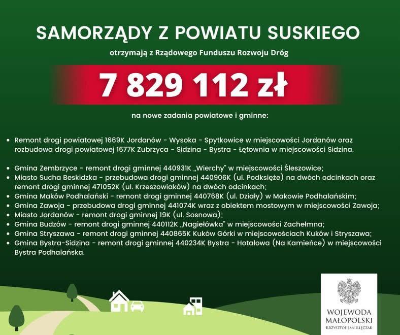 Powiat suski otrzyma 7 829 112 zł. Środki zostaną przeznaczone m.in. na remont drogi powiatowej Jordanów – Wysoka – Spytkowice oraz rozbudowę trasy Zubrzyca – Sidzina – Bystra – Łętownia. Wsparcie obejmie również zadania w gminach Zembrzyce, Maków Podhalański, Zawoja, Budzów, Stryszawa i Bystra-Sidzina oraz w miastach Sucha Beskidzka i Jordanów.
