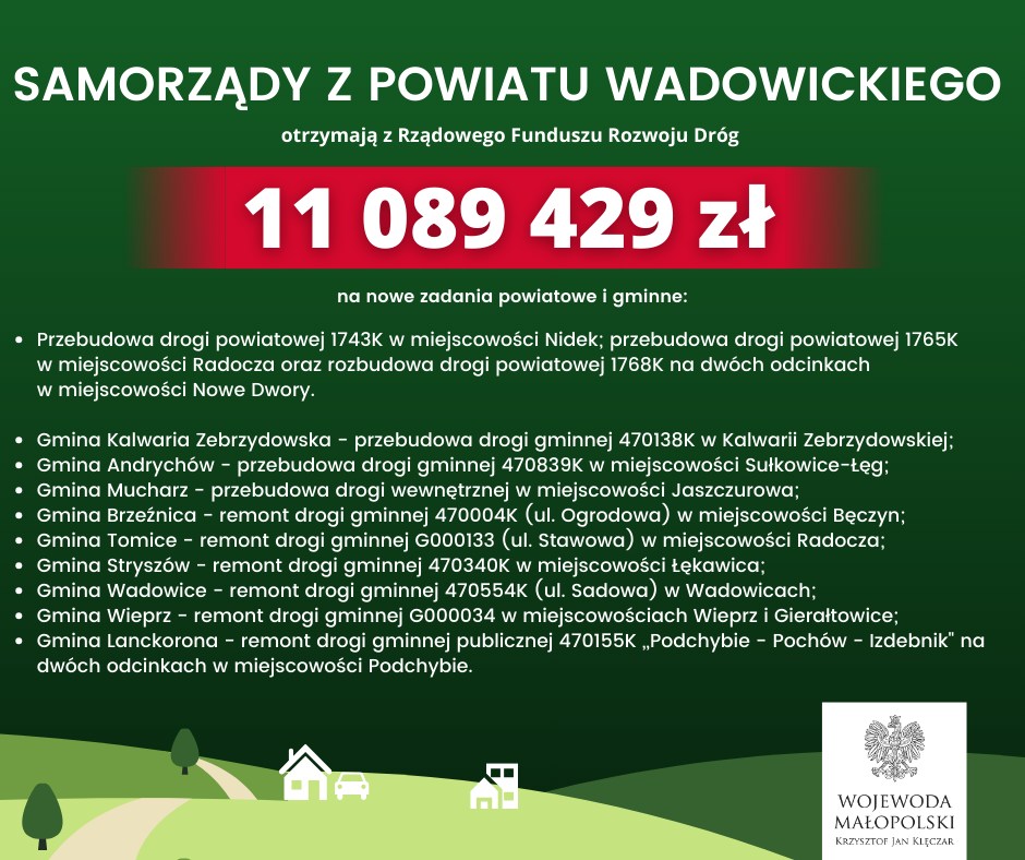 Pozyskane środki stanowią kolejny krok w kierunku zrównoważonego rozwoju sieci drogowej w Powiecie Wadowickim i realną inwestycję w komfort życia mieszkańców.