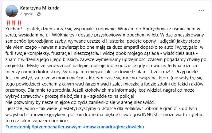 „Wracam do Andrychowa z uśmiechem w sercu, wysiadam na ul. Włókniarzy i dostaję przysłowiowym obuchem w łeb. Widzę zmasakrowany samochód (porozbijane szyby, wyrwane uszczelki i lusterka, pocięte opony), jakby stado nie wiem czego – nawet nie zwierząt, bo one mają za dużo empatii – dopadło to auto i wyrzygało w furii swoje kompleksy, frustracje i nieszczęścia” – napisała autorka poruszającego wpisu.
