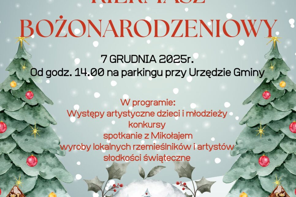 Zapraszamy serdecznie na kolejny Gminny Kiermasz Bożonarodzeniowy, który odbędzie się 7 grudnia (niedziela) od godziny 14:00 na parkingu przy Urzędzie Gminy.Wydarzenie, cieszące się dużą popularnością wśród mieszkańców, od lat tworzy wyjątkową, świąteczną atmosferę. Ciepło iluminacji, aromat tradycyjnych potraw, rękodzieło przygotowane z pasją oraz radość wspólnej integracji sprawiają, że kiermasz stał się piękną tradycją naszej gminy.W