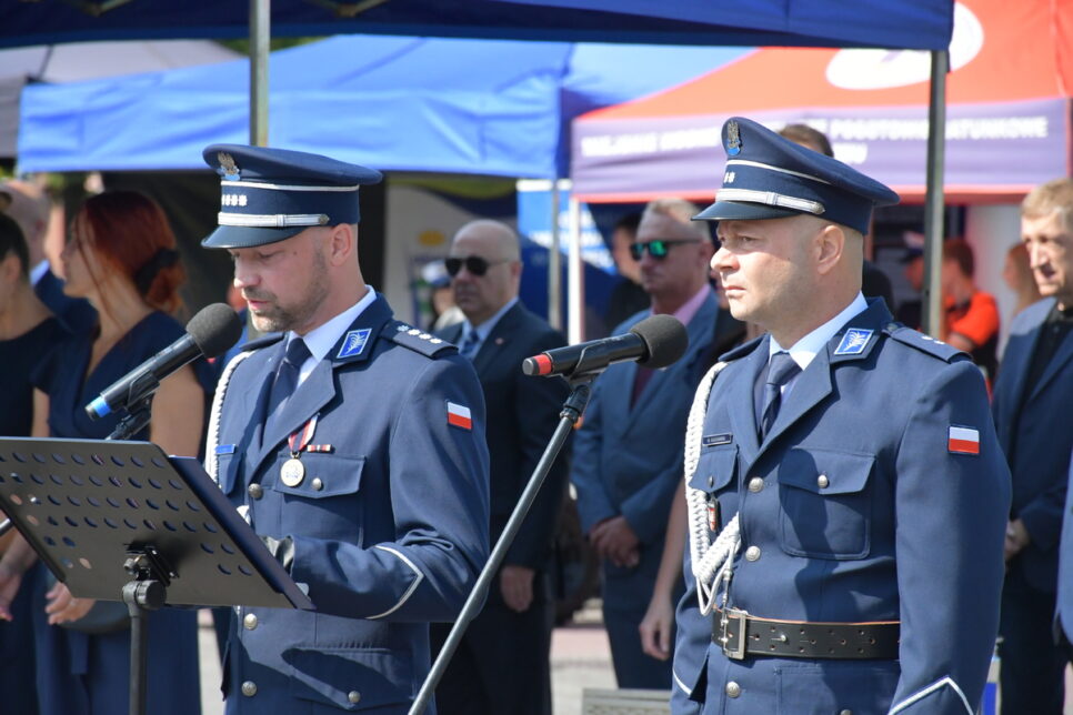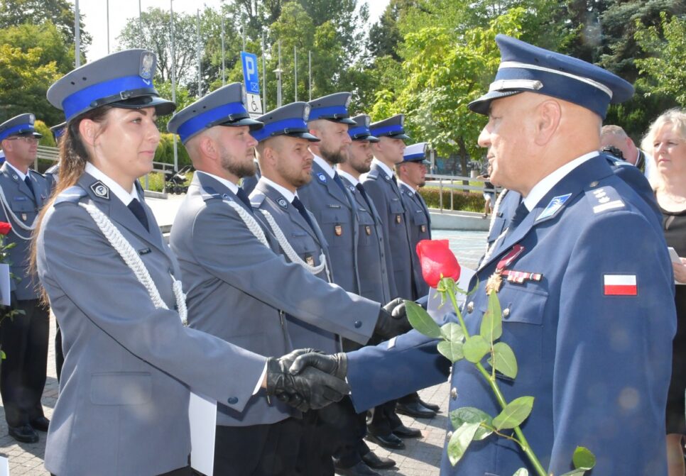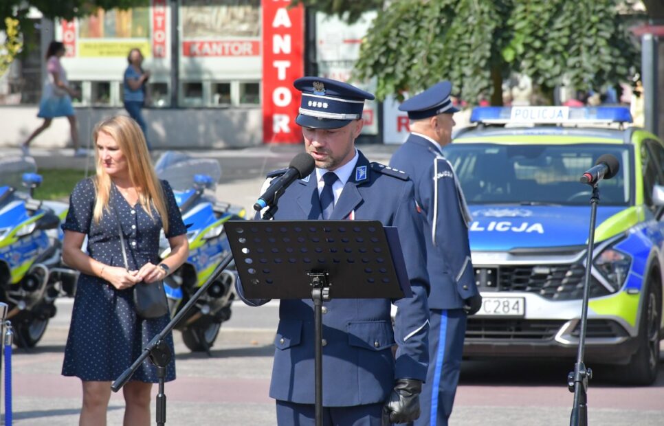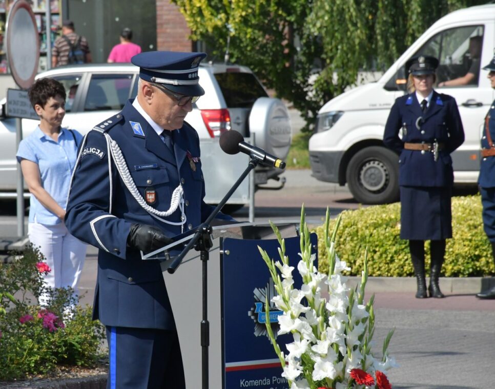 Wszystkich zebranych, policjantki, policjantów, pracowników Policji oraz przybyłych gości powitał Komendant Powiatowy Policji w Oświęcimiu inspektor Robert Chowaniec. Komendant w swoim przemówieniu nawiązał do obchodzonego w tym roku jubileuszu 105. rocznicy utworzenia Policji Państwowej podkreślając dumę z noszenia policyjnego munduru, pielęgnowania chlubnej tradycji i etosu służby policjanta. Przypomniał również, że tradycje Policji Państwowej w Oświęcimiu sięgają 1920 roku. To wtedy powstał tutaj pierwszy posterunek Policji, który swoją siedzibę miał w oświęcimskim Ratuszu, gdzie dziś możemy oglądać odrestaurowane cele dla zatrzymanych. Przypomniał również sylwetkę pierwszego oświęcimskiego komendanta Policji Państwowej, którym był Franciszek Suchanek. Zginął on w niemieckim obozie koncentracyjnym w Mauthausen. Komendant podkreślił, że przez ostatni rok, tak jak w latach ubiegłych policjanci powiatu oświęcimskiego, z ogromnym zaangażowaniem dbali o bezpieczeństwo mieszkańców powiatu oraz przyjeżdżających do powiatu oświęcimskiego turystów. Podkreślił, że wielu policjantów z powiatu oświęcimskiego pełniło również służbę na granicy z Białorusią strzegąc bezpieczeństwa Polaków. Następnie Komendant na ręce Starosty oświęcimskiego złożył podziękowania dla wszystkich samorządowców za wsparcie dotychczasowych inicjatyw Policji związanych z dbaniem o bezpieczeństwo ład i porządek publiczny. Na zakończenie przemówienia Komendant podziękował policjantom i pracownikom Policji za bardzo dobrą służbę i pracę, a także złożył gratulacje wszystkim wyróżnionym, odznaczonym i awansowanym, życząc im dalszych sukcesów w pracy zawodowej oraz szczęścia w życiu osobistym.