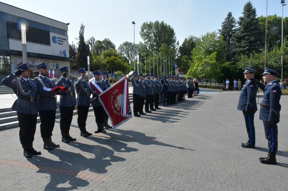 Uroczysty apel upamiętniający 105. rocznicę powołania Policji Państwowej, zakończył się odprowadzeniem sztandaru Komendy Powiatowej Policji w Oświęcimiu oraz złożeniem meldunku zastępcy Komendanta Wojewódzkiego Policji w Krakowie.