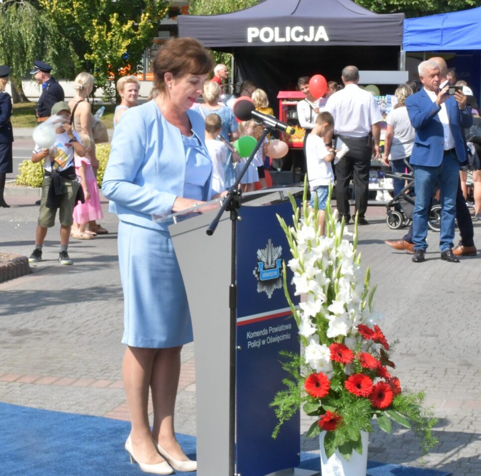 Następnie przemówienia wygłosili: Dyrektor Generalna Małopolskiego Urzędu Wojewódzkiego w Krakowie pani Lucyna Gajda oraz Starosta Oświęcimski pan Andrzej Skrzypiński, którzy docenili służbę policjantów na rzecz społeczeństwa, także złożyli gratulacje wszystkim wyróżnionym, odznaczonym i awansowanym.