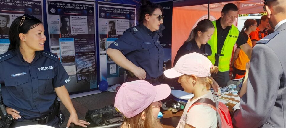W trakcie obchodów odbył się piknik profilaktyczny oraz stoisko ze słodyczami. Na policyjnym stoisku zorganizowanym przez oświęcimską Policję wspólnie z Oświęcimską Grupą Rekonstrukcji Historycznej Posterunek Policji Państwowej w Oświęcimiu, zaprezentowany został sprzęt i wyposażenie policjanta oraz radiowozy i motocykl. Policjanci przybliżali uczestnikom zagadnienia związane z zasadami bezpieczeństwa podczas wakacji. Przestrzegali przed różnego rodzaju cyberzagrożeniami, czy oszustwami internetowymi. Informowali o przepisach ruchu drogowego niezwykle ważnymi dla pieszych oraz kierowców. Opowiadali jak wygląda i na czym polega służba w różnych pionach Policji, zachęcając uczestników do wstąpienia do służby w Policji. Dzieci miały możliwość sprawdzenia jak wygląda radiowóz od środka, a także mogły zobaczyć własne odciski palców i dowiedzieć się jak Policja wykorzystuje ślady daktyloskopijne do ścigania przestępców. Dzieci chętnie przymierzały akcesoria policyjne, a rodzice robili im pamiątkowe zdjęcia. Uczestnicy zapoznawali się również z historią Policji oraz umundurowaniem przedwojennych policjantów, które prezentowali na sobie przedstawiciele Grupy Rekonstrukcji Historycznej Posterunek Policji Państwowej w Oświęcimiu. Uczestnicy mogli również podziwiać prace plastyczne dzieci z gminy Oświęcim wykonane na konkurs pt. Laurka dla policjanta na Święto Policji. Organizatorem konkurs była Szkoła Podstawowa w Harmężach oraz Gmina Oświęcim. Na wystawie można było również zobaczyć makietę radiowozu policyjnego wykonanego przez dzieci ze Żłobka Miejskiego w Oświęcimiu