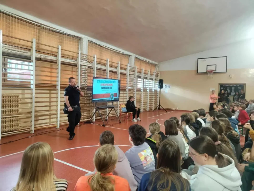 Na początku uczniowie usłyszeli, czym właściwie jest cyberprzemoc i dlaczego potrafi wyrządzić tak samo dotkliwe szkody jak agresja w realnym świecie. Prelegent wyliczył najczęstsze formy przemocy w sieci – nękanie w wiadomościach, ośmieszające materiały wrzucane do internetu, kradzież tożsamości czy podszywanie się pod rówieśników. Inspektor podkreślił, że każda z tych sytuacji zostawia ślad i może pociągać za sobą poważne konsekwencje.