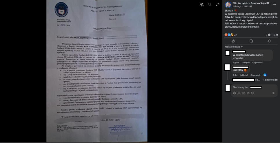 Ale Filip Kaczyński nie byłby sobą gdyby czegoś nie pochrzanił. Publikując w swoich mediach społecznościowych pismo z ABW nie zakrył danych jednostki OSP, do której to pismo trafiło. Jak możemy wyczytać, „donieśli” posłowi Kaczyńskiemu druhowie z OSP Sarnowa Góra…