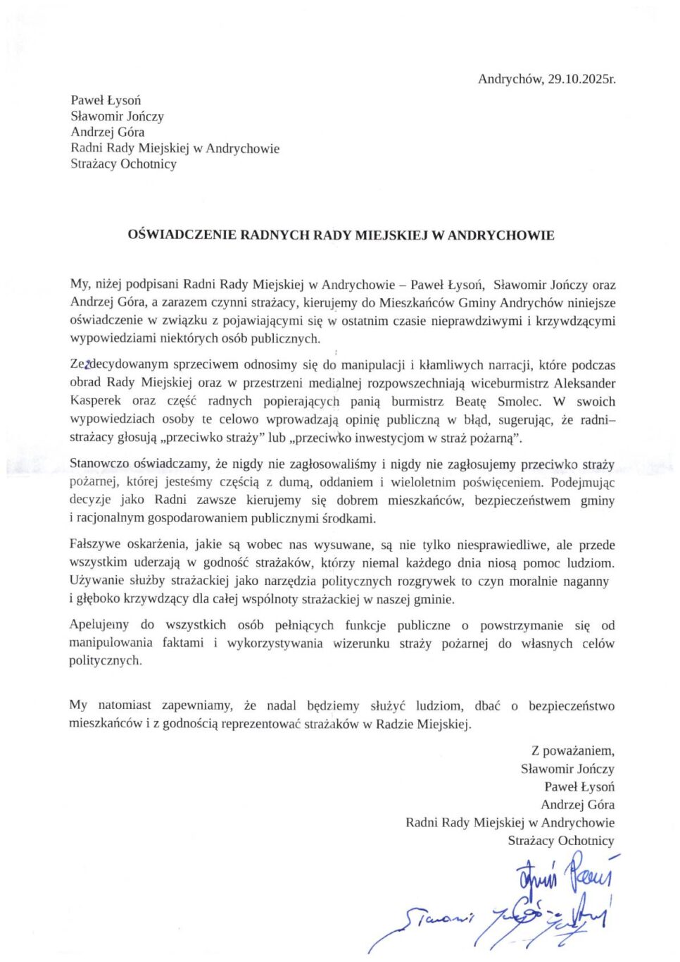 W swoim piśmie skierowanym do mieszkańców gminy radni stanowczo odrzucają zarzuty, jakoby podczas sesji Rady Miejskiej mieli głosować „przeciwko straży” lub „przeciwko inwestycjom w straż pożarną”. Wskazują, że takie sugestie miały paść z ust wiceburmistrza Aleksandra Kasperka oraz części radnych wspierających burmistrz Beatę Smolec. „To manipulacje i kłamliwe narracje” – podkreślają autorzy oświadczenia, dodając, że ich decyzje w radzie zawsze kierowane są troską o bezpieczeństwo mieszkańców i racjonalnym gospodarowaniem publicznymi pieniędzmi.