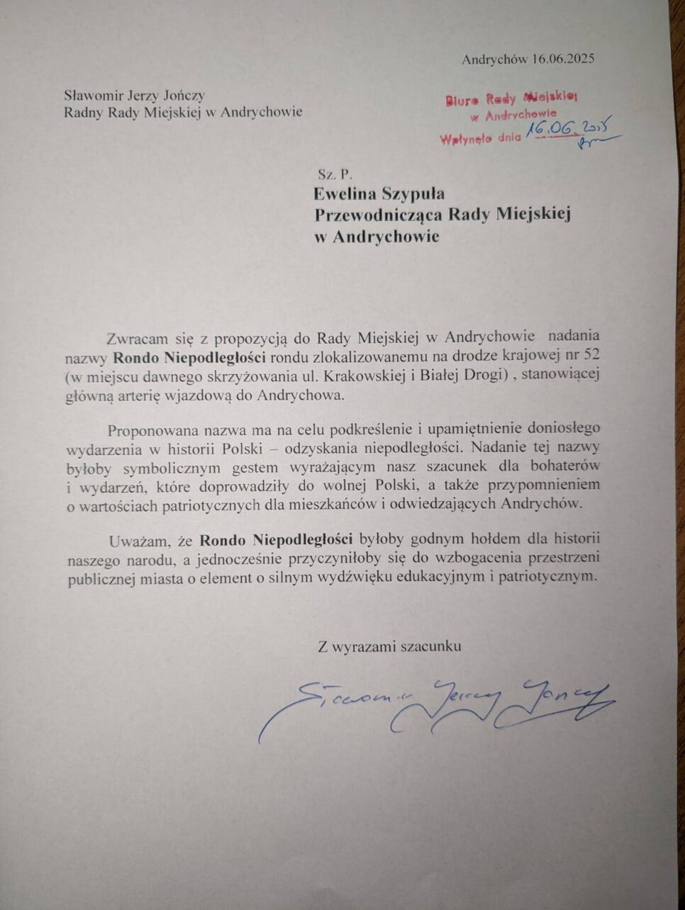 W swoim piśmie radny podkreśla, że nadanie rondu tej nazwy byłoby symbolicznym wyrazem szacunku dla bohaterów, którzy przyczynili się do odzyskania przez Polskę wolności. Jak zaznacza, taki gest miałby nie tylko charakter upamiętniający, ale również edukacyjny – przypominałby o wartościach patriotycznych zarówno mieszkańcom Andrychowa, jak i osobom odwiedzającym miasto.