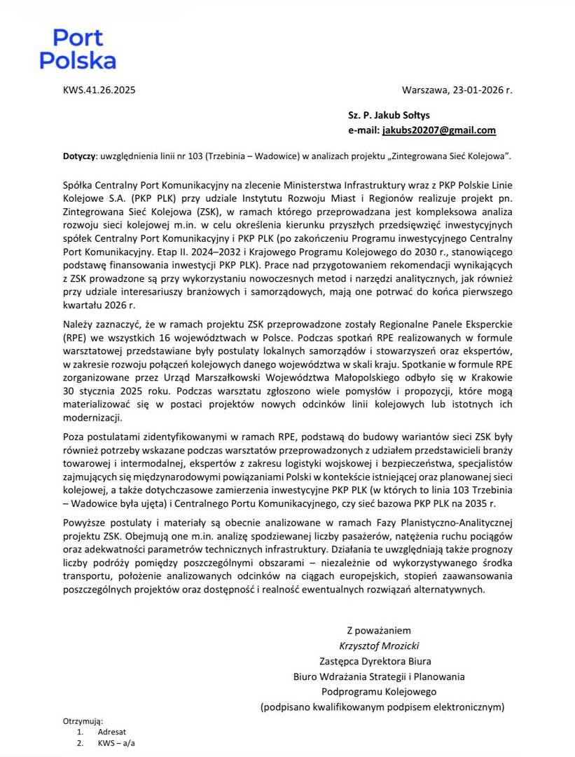 Uwzględnienie linii nr 103 w analizach Zintegrowanej Sieci Kolejowej nie oznacza jeszcze przełomu, ale jest wyraźnym sygnałem, że temat nie został zamknięty. Dla wielu mieszkańców regionu to pierwszy od lat powód, by z ostrożnym optymizmem patrzeć na przyszłość kolejowego połączenia Trzebini, Spytkowic i Wadowic.