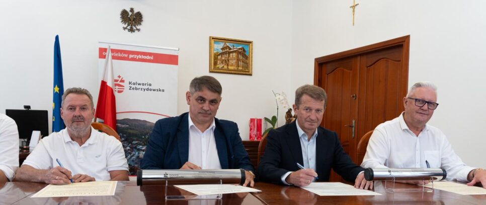 W Kalwarii Zebrzydowskiej odbyło się uroczyste spotkanie z udziałem przedstawicieli samorządu oraz administracji rządowej, podczas którego omówiono postępy w realizacji dwóch ważnych inwestycji sportowych. W wydarzeniu uczestniczyli m.in. Starosta Wadowicki Mirosław Sordyl, członek zarządu powiatu Sebastian Mlak, burmistrz Tadeusz Stela, przewodniczący rady miejskiej Paweł Hebda, wiceprzewodniczący Piotr Kumor oraz kierownik referatu inwestycji Stanisław Kosek.