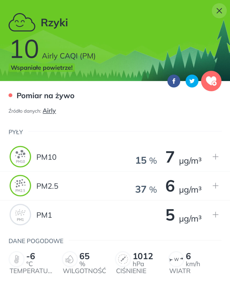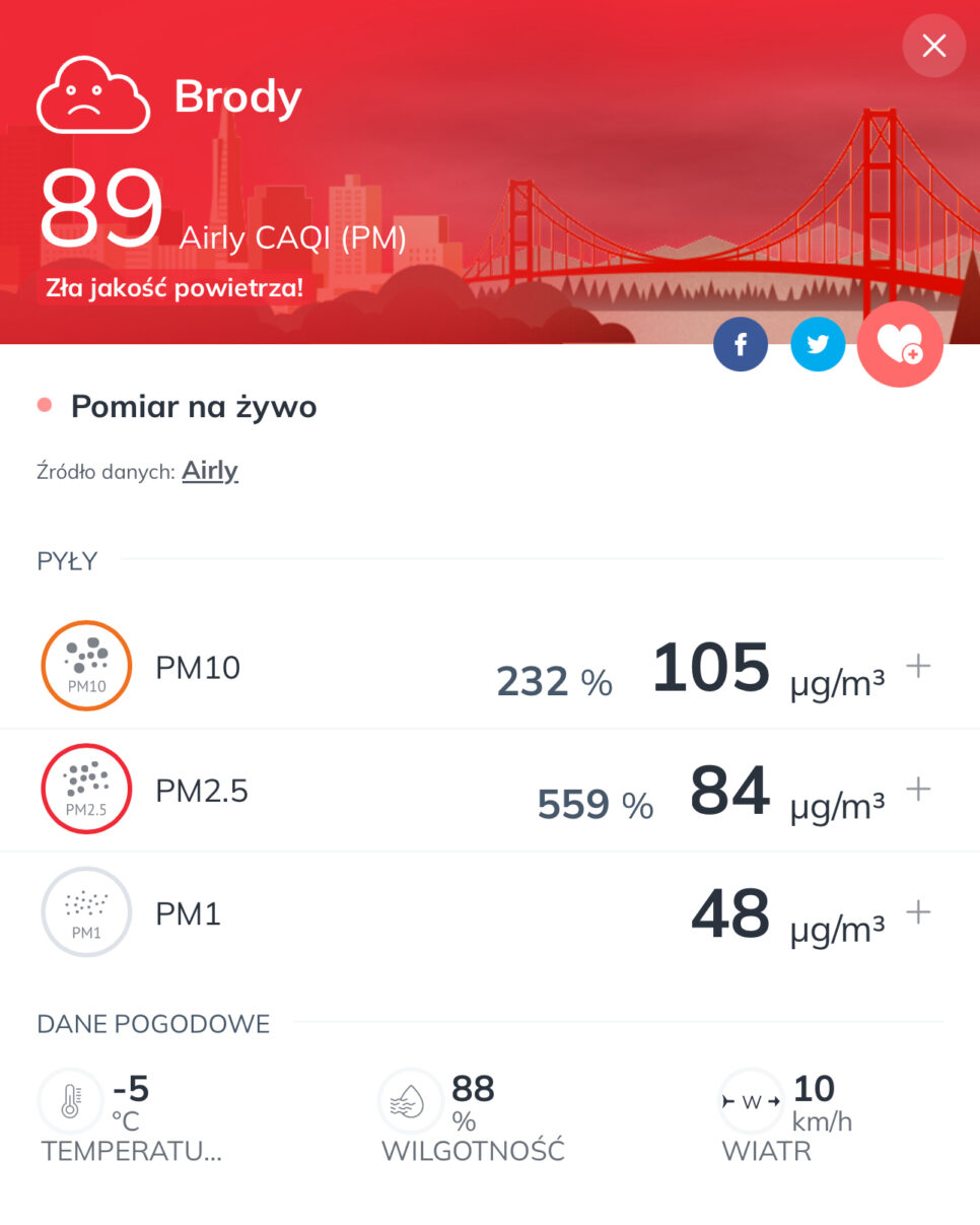 Na tle czerwonych i pomarańczowych wskaźników wyróżniają się Rzyki, gdzie CAQI zatrzymało się na poziomie 10, a stężenia pyłów są wielokrotnie niższe. To pokazuje, jak duże różnice potrafią występować w niewielkiej odległości. Dodatkowe dane — jak temperatura, wilgotność, ciśnienie i wiatr — nie są jedynie ciekawostką. Przy mrozie, bezwietrznej pogodzie i wysokiej wilgotności zanieczyszczenia „zawisają” nad miejscowościami dłużej, co dziś mogliśmy zobaczyć niemal jak na dłoni.