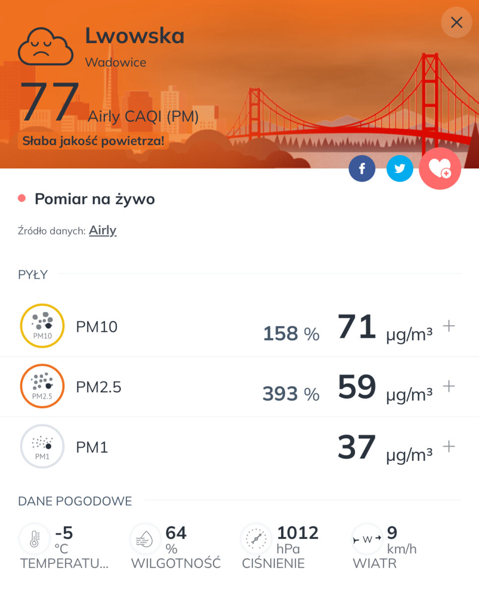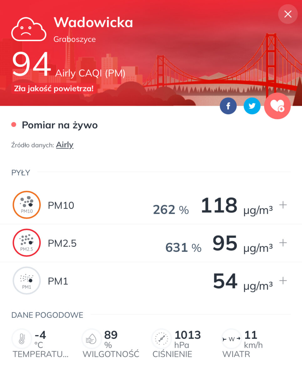 Poranek w wielu miejscowościach powiatu nie zaczął się zbyt optymistycznie. Zestawienie odczytów z czujników pokazuje, że w kilku punktach wskaźniki jakości powietrza wyraźnie przekroczyły normy. Najgorzej wygląda sytuacja w rejonie Wadowickiej w Graboszycach, gdzie Airly CAQI osiągnęło poziom 94, co oznacza bardzo złą jakość powietrza. Podobny obraz widać w Brodach, a nieco łagodniej — choć wciąż niepokojąco — na Lwowskiej w Wadowicach i przy Krakowskiej w Andrychowie.