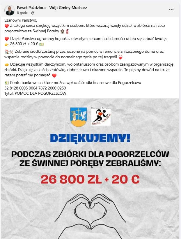 Pożar dotknął mieszkańców Świnna Poręba, jednak skala zaangażowania pokazała, że lokalna wspólnota potrafi działać razem w obliczu nieszczęścia. Wójt podziękował darczyńcom, wolontariuszom oraz wszystkim osobom zaangażowanym w organizację zbiórki, podkreślając, że każda wpłata i każdy gest wsparcia mają realne znaczenie dla poszkodowanej rodziny.