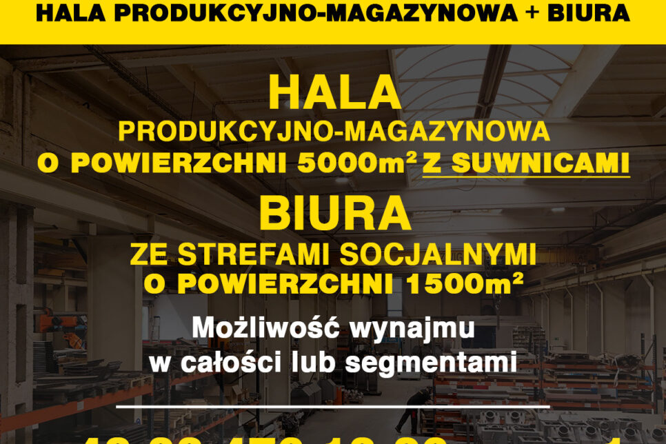 W Andrychowie przy ulicy Przemysłowej 21 dostępna jest do wynajęcia przestronna hala produkcyjno-magazynowa wraz z zapleczem biurowym. Obiekt wyróżnia się dużą powierzchnią użytkową oraz dogodnym układem, który pozwala na elastyczne dopasowanie przestrzeni do potrzeb najemcy. Hala o powierzchni 5000 m² wyposażona jest w suwnice, co znacząco ułatwia organizację procesów logistycznych i produkcyjnych. To rozwiązanie, które […]