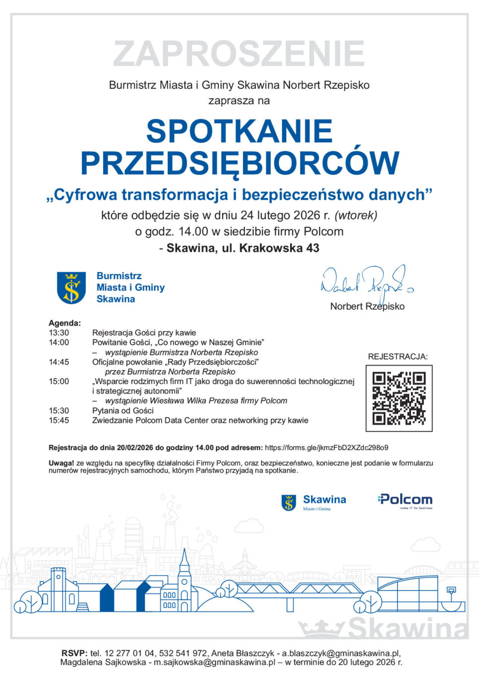 Burmistrz Miasta i Gminy Skawina zaprasza przedsiębiorców na kolejne spotkanie, które skupi się na zagadnieniach związanych z cyfrową transformacją oraz ochroną danych — tematach istotnych dla rozwoju nowoczesnych i konkurencyjnych firm.