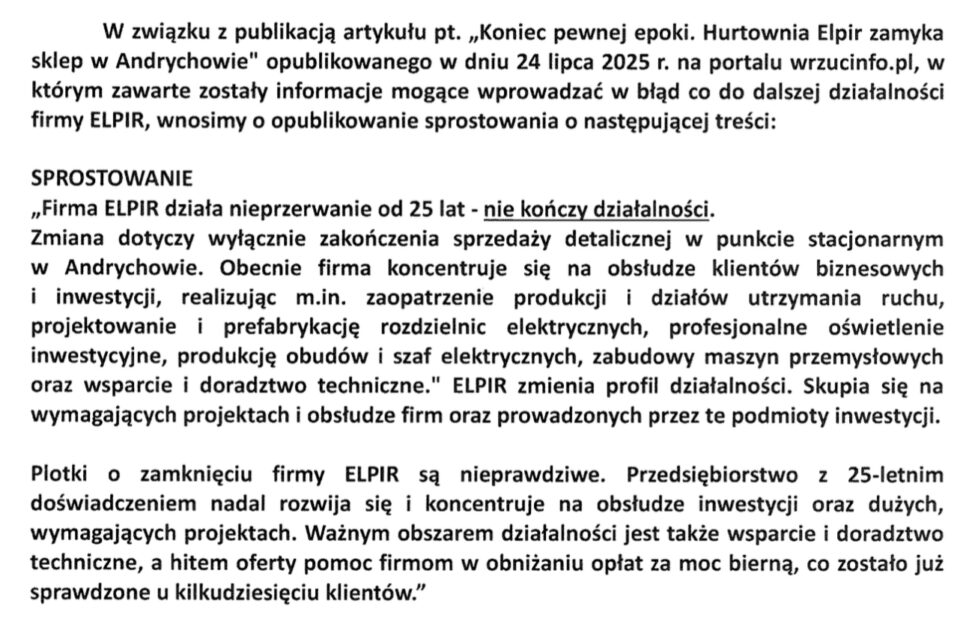 Sprostowanie w sprawie firmy Elpir w Andrychowie