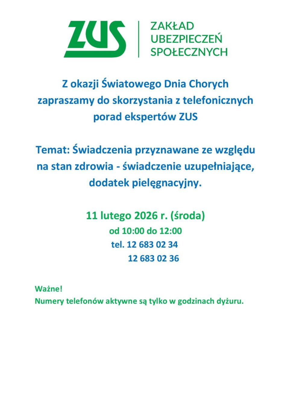 Z okazji obchodów Światowego Dnia Chorych uruchomiony zostanie specjalny dyżur telefoniczny, podczas którego będzie można uzyskać informacje dotyczące świadczeń przysługujących ze względu na stan zdrowia.