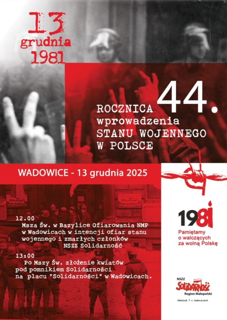 Wadowicki Oddział Regionu Małopolskiego NSZZ Solidarność serdecznie zaprasza mieszkańców do uczczenia pamięci osób poszkodowanych w czasie stanu wojennego oraz tych, którzy pod sztandarem „Solidarności” walczyli o odzyskanie wolności i niepodległości Polski.