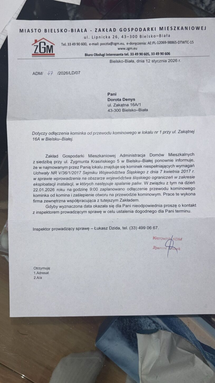 Według pisma ZGM prace mają zostać wykonane w styczniu, a powodem jest niespełnianie wymogów uchwały antysmogowej. Mieszkanka nie kryje oburzenia, bo – jak podkreśla – posiada protokoły i dokumentację potwierdzającą możliwość użytkowania kominka przy spalaniu suchego drewna, zgodnie z obowiązującymi normami.