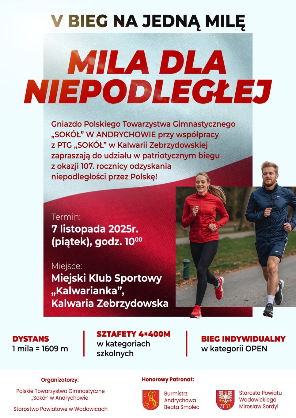 Już w najbliższy piątek, 7 listopada o godz. 10:00, wystartuje V Sokoli Bieg na Jedną Milę – „Mila dla Niepodległej”, organizowany przez PTG „Sokół” w Andrychowie we współpracy z PTG „Sokół” w Kalwarii Zebrzydowskiej. Wydarzenie odbędzie się na stadionie MKS Kalwarianka w Kalwarii Zebrzydowskiej i – jak co roku – połączy sport z patriotyzmem.