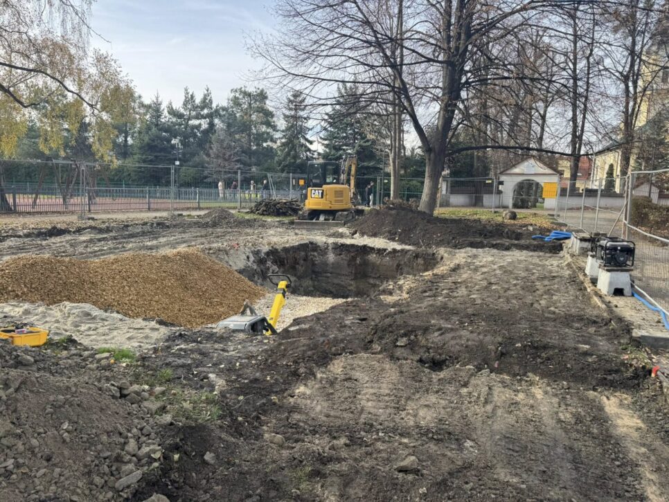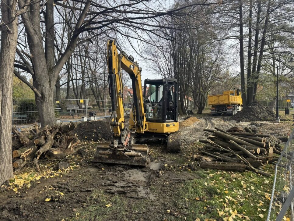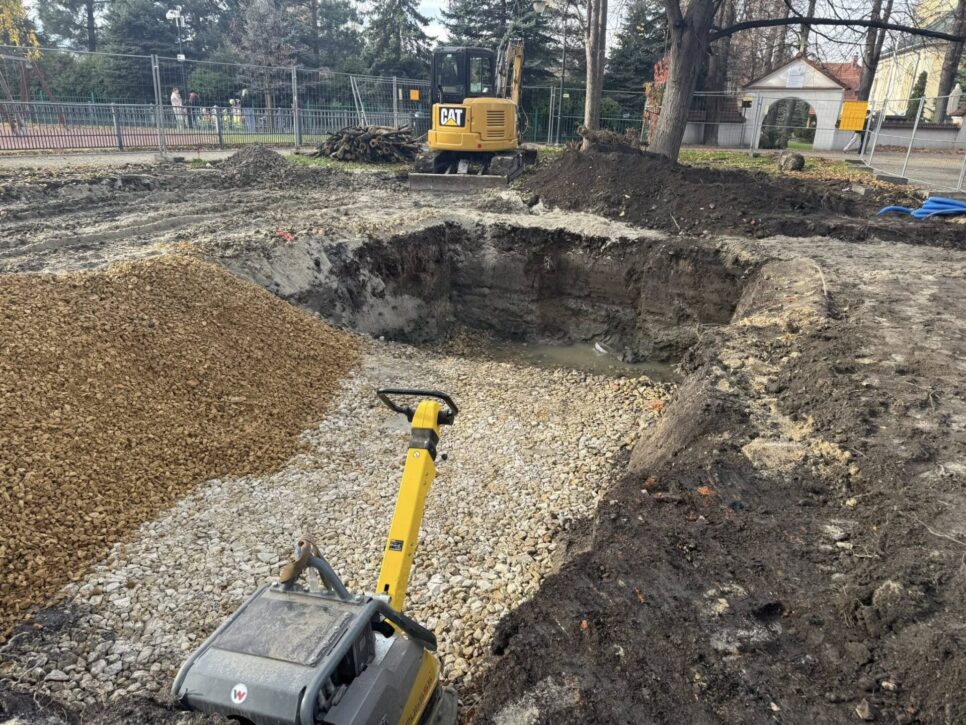 Obecnie teren inwestycji wygląda jak porządny plac budowy. Pojawiły się koparki, ciężarówki, wyznaczono głębokie wykopy, a wejście do części parku bywa chwilowo ograniczone. To naturalny etap, ale warto mieć na uwadze bezpieczeństwo własne i najmłodszych – zwłaszcza że prace odbywają się tuż obok placu zabaw.