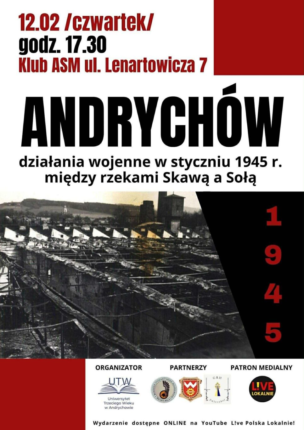 Uniwersytet Trzeciego Wieku w Andrychowie zaprasza na otwartą prelekcję historyczną poświęconą działaniom wojennym prowadzonym na terenie miasta i okolic w styczniu 1945 roku. Wydarzenie odbędzie się w czwartek, 12 lutego, o godzinie 17.30 w Klubie ASM przy ulicy Lenartowicza 7 w Andrychowie. Spotkanie skierowane jest do wszystkich zainteresowanych historią regionu i ostatnimi miesiącami II wojny światowej.