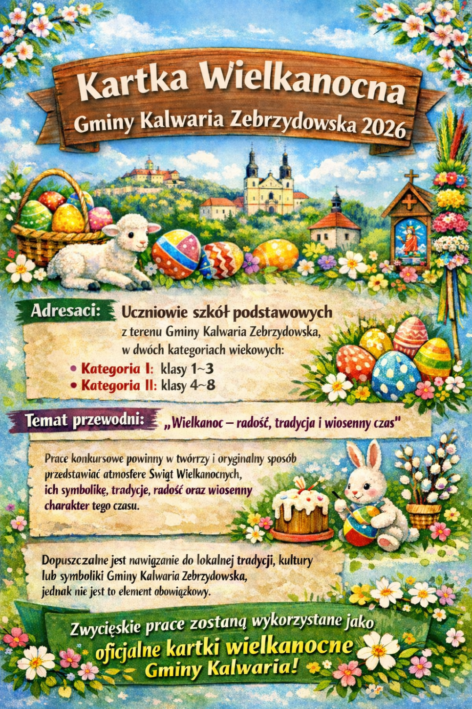 Gmina Kalwaria Zebrzydowska zaprasza najmłodszych mieszkańców do udziału w konkursie plastycznym „Kartka Wielkanocna Gminy Kalwaria Zebrzydowska 2026”. Inicjatywa skierowana jest do uczniów szkół podstawowych z terenu gminy i ma na celu połączenie twórczej aktywności dzieci z pielęgnowaniem wielkanocnych tradycji oraz lokalnej tożsamości. Organizatorzy zachęcają do indywidualnego, autorskiego spojrzenia na święta, bez narzucania jednego schematu czy stylu.