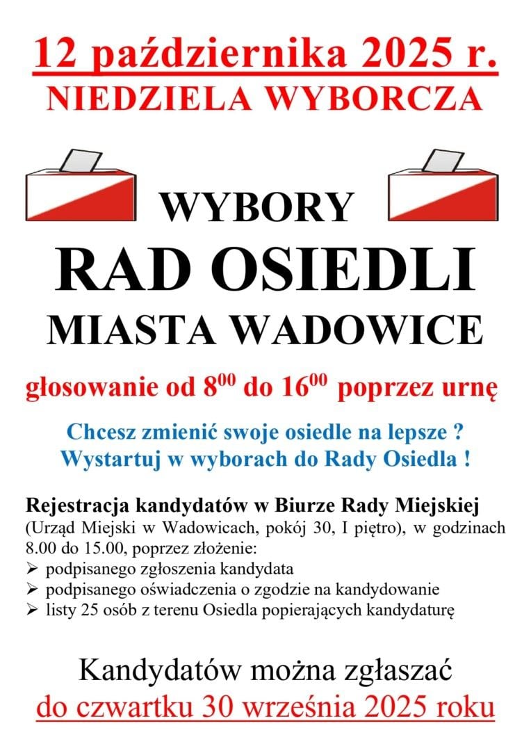Każde z nich wybierze 15 członków Rady Osiedla. Wybory będą powszechne, równe, bezpośrednie i tajne. Udział w głosowaniu mogą wziąć wszyscy mieszkańcy osiedla zameldowani na pobyt stały w gminie Wadowice lub wpisani do stałego rejestru wyborców. Do lokalu wyborczego należy zabrać ze sobą dowód osobisty lub inny dokument potwierdzający tożsamość ze zdjęciem.