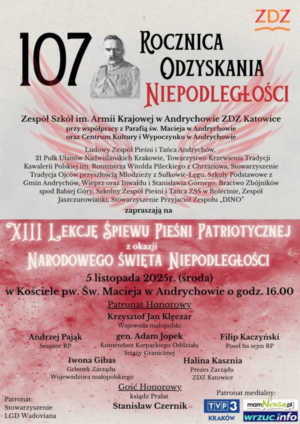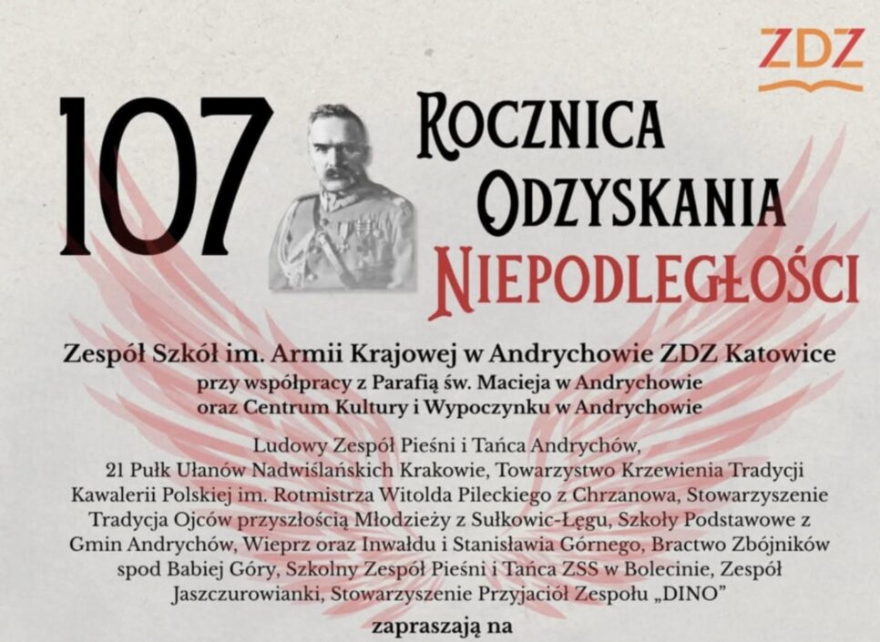 5 listopada w kościele św. Macieja w Andrychowie odbędzie się XIII Lekcja Śpiewu Pieśni Patriotycznej z okazji 107. rocznicy odzyskania przez Polskę niepodległości. Początek o godz. 16.00. Organizatorem jest Zespół Szkół im. Armii Krajowej w Andrychowie ZDZ Katowice przy współudziale parafii i miejscowego Centrum Kultury. Na scenie pojawią się m.in. zespoły pieśni i tańca, grupy historyczne, szkoły oraz stowarzyszenia pielęgnujące tradycję niepodległościową. Patronat honorowy nad wydarzeniem objęli m.in. wojewoda małopolski Krzysztof Jan Klęczar, gen. Adam Jopek, senator Andrzej Pająk oraz parlamentarzyści. Organizatorzy podkreślają, że wspólne śpiewanie to żywa lekcja historii i zapraszają mieszkańców do udziału.