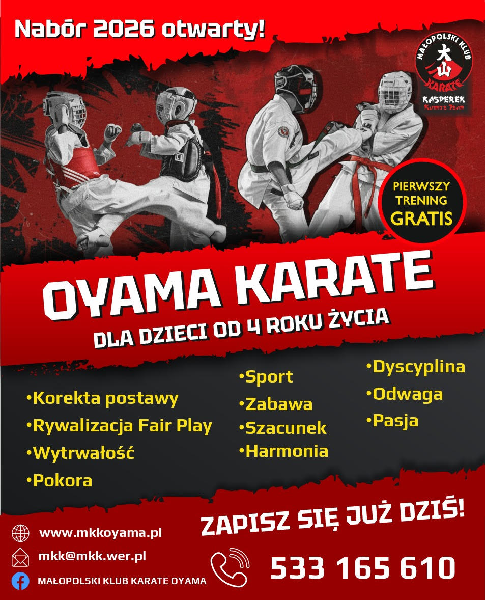 Małopolski Klub Karate OYAMA to jedna z największych struktur tego typu w regionie, obejmująca ponad 50 lokalizacji w Małopolsce. Klub od lat szkoli dzieci i młodzież, przygotowując ich zarówno do startów sportowych, jak i do codziennych wyzwań. Szczegóły dotyczące zapisów i harmonogramów treningów można uzyskać w wiadomości prywatnej lub telefonicznie.