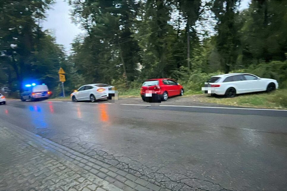 Kolizja dwóch pojazdów na mokrej nawierzchni. Zakrzów
