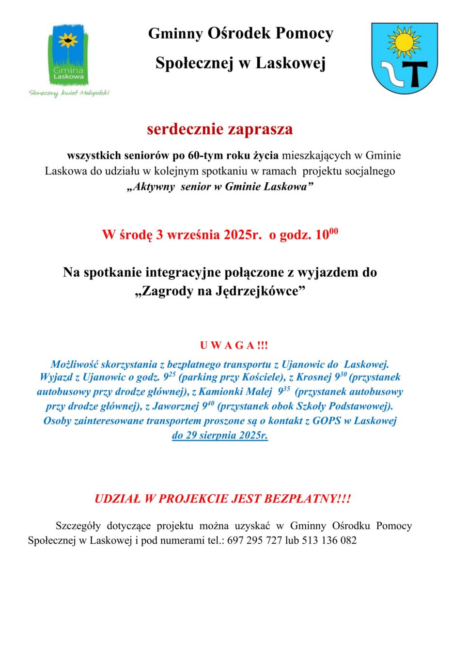 Gminny Ośrodek Pomocy Społecznej w Laskowej zaprasza mieszkańców gminy powyżej 60. roku życia na kolejne spotkanie w ramach projektu „Aktywny senior w Gminie Laskowa”. Wydarzenie odbędzie się w środę, 3 września 2025 roku o godzinie 10:00 i będzie połączone z wyjazdem integracyjnym do „Zagrody na Jędrzejkówce”.