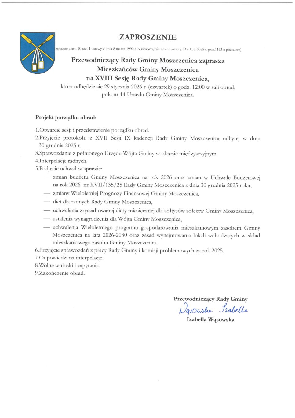 Izabella Wąsowska, przewodnicząca Rady Gminy Moszczenica, zaprasza wszystkich mieszkańców gminy na XVIII sesję Rady Gminy Moszczenica, która odbędzie się 29 stycznia 2026 roku (czwartek) o godzinie 12:00 w sali obrad, pok. nr 14 Urzędu Gminy Moszczenica.