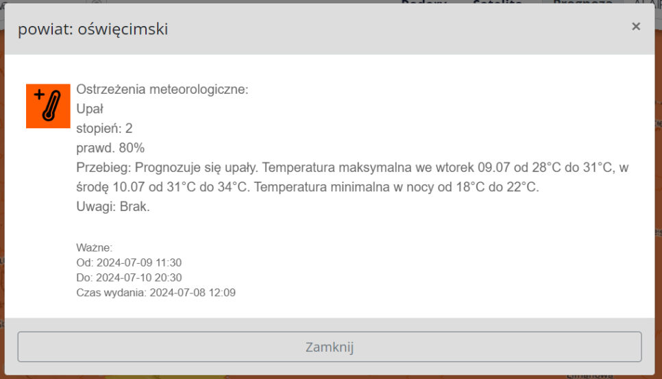 Instytut Meteorologii i Gospodarki Wodnej wydał ostrzeżenie drugiego stopnia przed upałami, które obejmuje dni 9 i 10 lipca. Prognozowane temperatury maksymalne sięgają od 28°C do 34°C, a minimalne w nocy od 18°C do 22°C. Prawdopodobieństwo wystąpienia upałów oceniane jest na 80%.