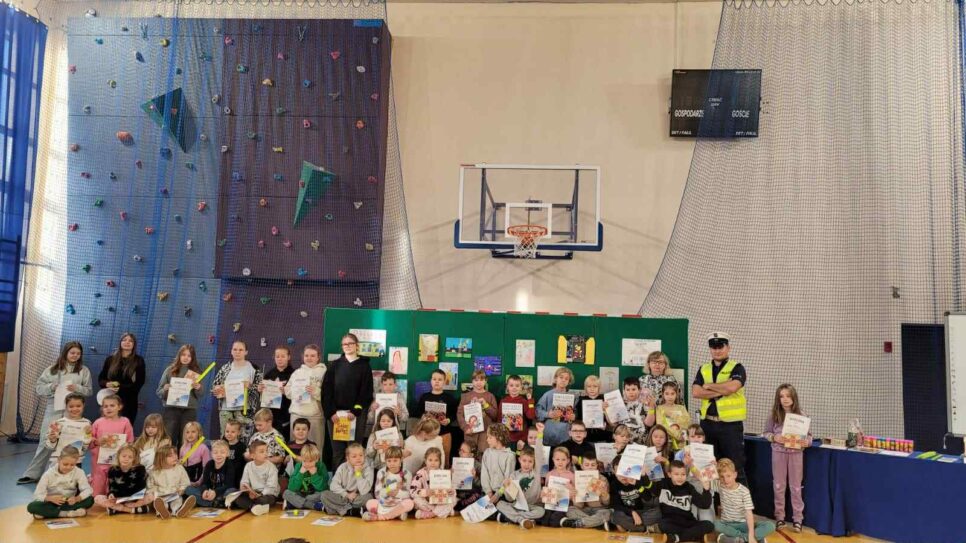 Na terenie szkoły został przeprowadzony konkurs wiedzy ogólnej o bezpieczeństwie w ruchu drogowym. Wzięło w nim udział 54 uczniów. Dzieci wykazały się ogromną wiedzą w zakresie znajomości znaków i zasad ruchu drogowego – w grupie młodszej w celu wyłonienia zwycięzców przeprowadzono dogrywkę. W trakcie akcji zorganizowaliśmy także konkurs plastyczny, w którym uczestniczyło 34 uczniów. Dzieci samodzielnie wykonały pomysłowe prace zachęcające do noszenia odblasków.