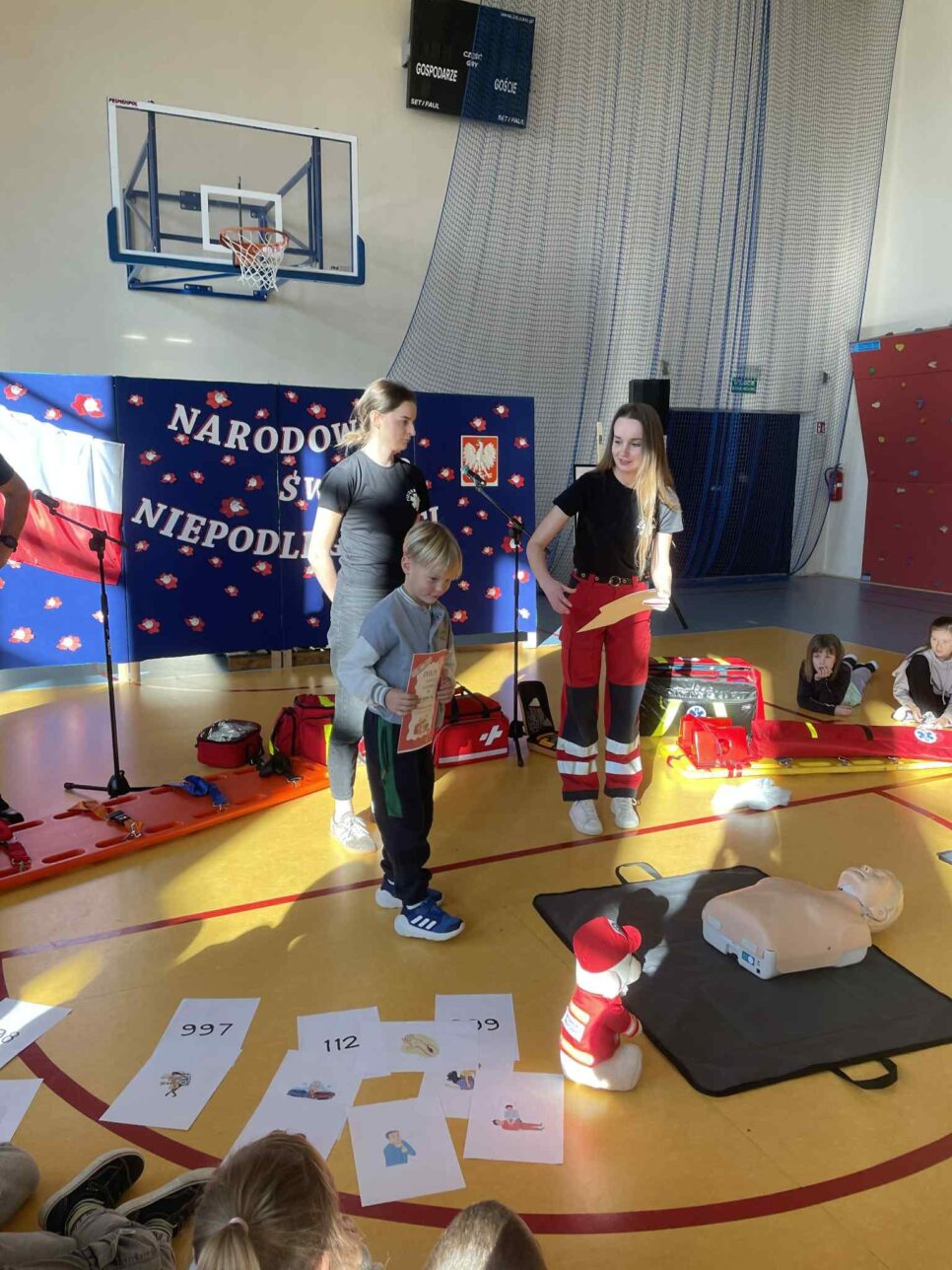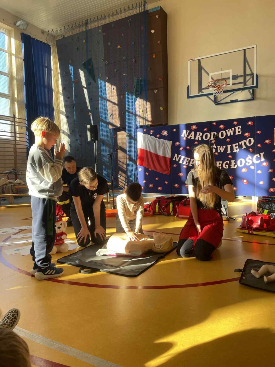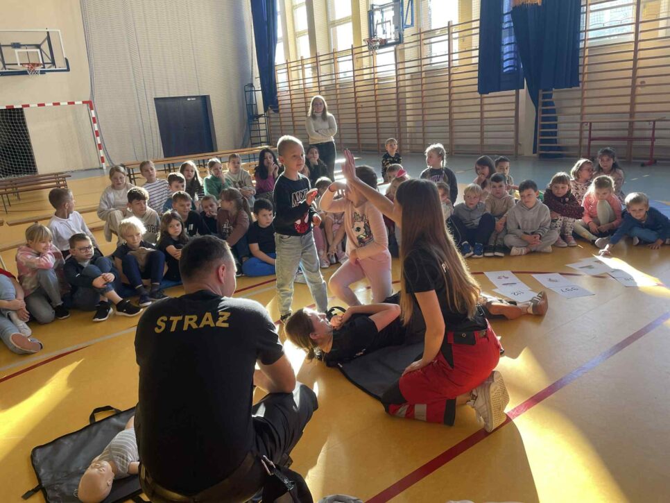 Oprócz wymienionych wyżej aktywności promowaliśmy idee bezpieczeństwa w ruchu drogowym wśród lokalnej społeczności – na stronach internetowych i w social mediach, aby dotrzeć do jak największej liczby osób. Współpracowaliśmy z różnymi podmiotami. Zorganizowaliśmy warsztaty z pierwszej pomocy, które poprowadziły pielęgniarki oraz strażak z Państwowej Straży Pożarnej. Dzieci przypomniały sobie zasady zawiadamiania służb oraz udzielania pierwszej pomocy. Uczniowie brali czynny udział w zajęciach, a na koniec każda klasa otrzymała pamiątkowy dyplom. Dodatkowo zaprosiliśmy na spotkanie aspiranta Mariusza Bryłę, asystenta Wydziału Ruchu Drogowego w Wadowicach, który przypomniał dzieciom zasady ruchu drogowego. Spotkanie było też swego rodzaju zakończeniem i podsumowaniem akcji na terenie naszej placówki. Dzieci były zachwycone, gdy otrzymały z rąk policjanta pamiątkowe dyplomy i nagrody za osiągnięcia.