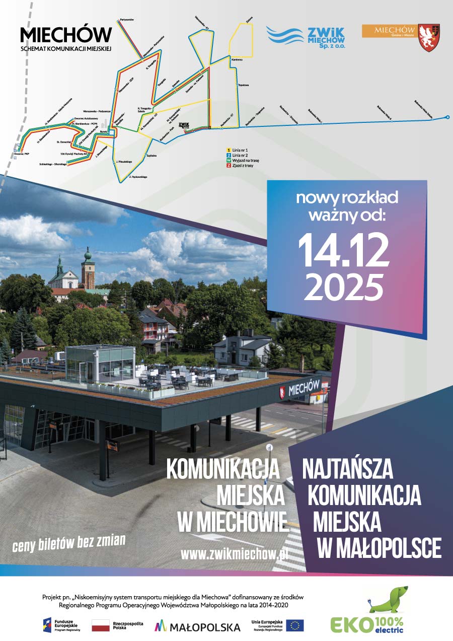 Od najbliższej niedzieli, 14 grudnia 2025 r., w Miechowie wprowadzone zostaną zmiany w funkcjonowaniu komunikacji miejskiej. Trasy kursów autobusów elektrycznych zostały dostosowane do kolejnej zmiany rozkładu SKA.