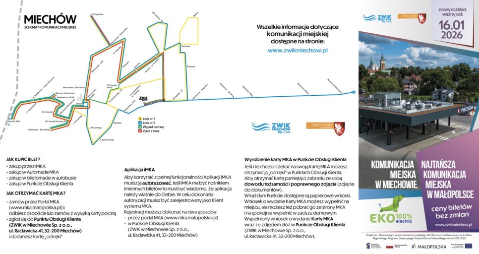 Od piątku, 16 stycznia 2025 roku, w Miechowie wprowadzane są zmiany w kursowaniu komunikacji miejskiej. Trasy autobusów elektrycznych zostały dostosowane do kolejnej korekty rozkładu SKA.