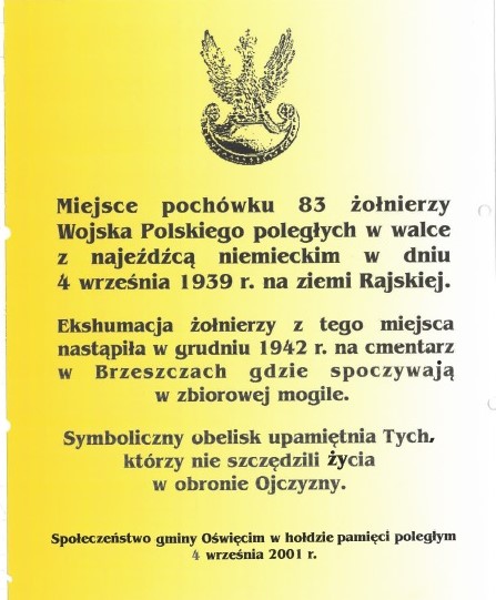 Kradzież dotyczy tablicy informującej o miejscu pochówku 83 żołnierzy Wojska Polskiego, którzy polegli w walce z niemieckim najeźdźcą w dniach 4 i 5 września 1939 roku na ziemi rajskiej. Po ekshumacji w 1942 roku szczątki poległych zostały przeniesione na cmentarz w Brzeszczach, gdzie spoczywają w zbiorowej mogile. Obelisk w Rajsku miał charakter symboliczny i stanowił trwałe upamiętnienie ofiary żołnierzy, którzy oddali życie w obronie Ojczyzny.