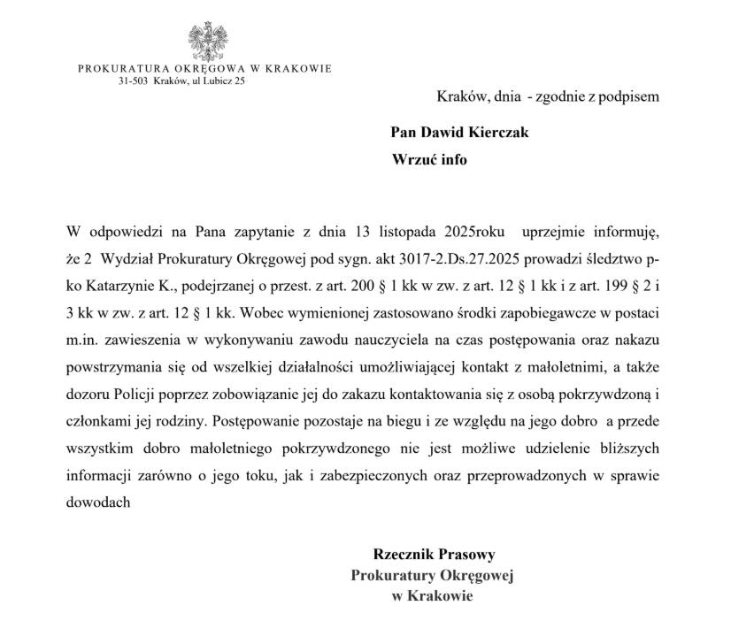 We wrześniu bieżącego roku prokuratura wszczęła śledztwo dotyczące Katarzyny K. Prokuratura Okręgowa w Krakowie prowadzi postępowanie w sprawie podejrzenia popełnienia czynów o charakterze seksualnym z udziałem małoletniego. Zarzuty obejmują przepisy art. 200 §1 kk oraz art. 199 §2 i §3 kk, w obu przypadkach w związku z art. 12 §1 kk. To poważne paragrafy, za które grozi nawet do 15 lat pozbawienia wolności, a sama sprawa jest prowadzona w pełnej dyskrecji, z uwagi na dobro pokrzywdzonego.